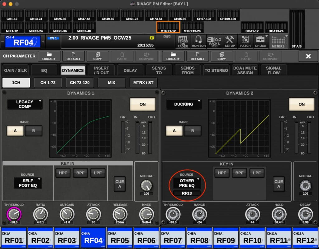 To achieve this, I set up Dynamics 2 ducking on the Rivage, keying each translator’s RF channel as the duck source for their paired barista (for example, RF13 triggering a duck on RF04). It wasn’t overly complex but required constant attention — massaging the threshold, attack, hold, and decay to make it sound natural, especially with the next competition wiring in simultaneously on the opposite side of the stage.