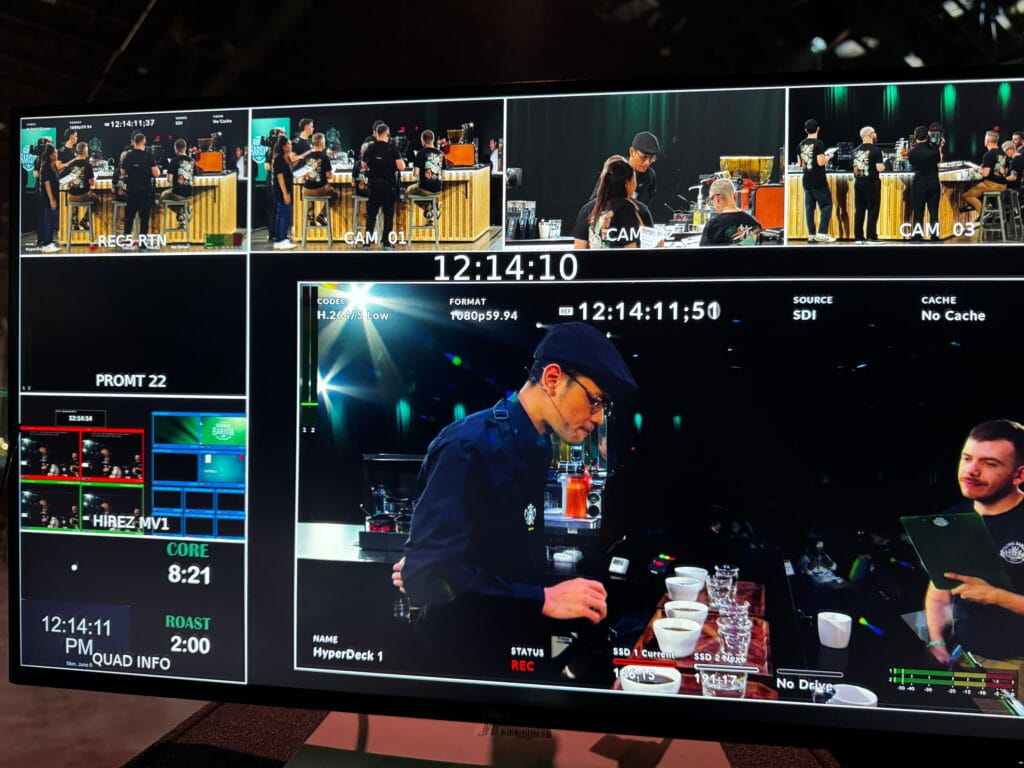After each round, hosts interviewed the baristas. Because many competitors didn’t speak English, each had an on-stage translator, both mic’d and fitted with IFBs so they could hear one another clearly over the noise. During this time, the judges would also jump in with questions of their own, offering feedback on presentation, technique, and taste before reporting their scores — explaining to the audience why each drink earned its mark.